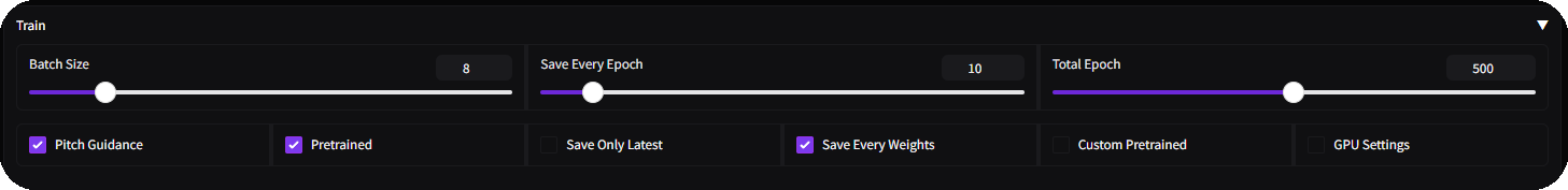 - Pretrained: Uses the RVC pretrained, used for training common models, uncheck if you want to make a pretrain.