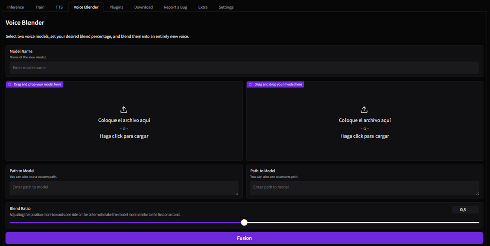 Go to the Voice Blender section, place the Model Name of your new model, drag or upload the pth A and B files below, adjust the Audio Blend if desired, and click the Fusion button.